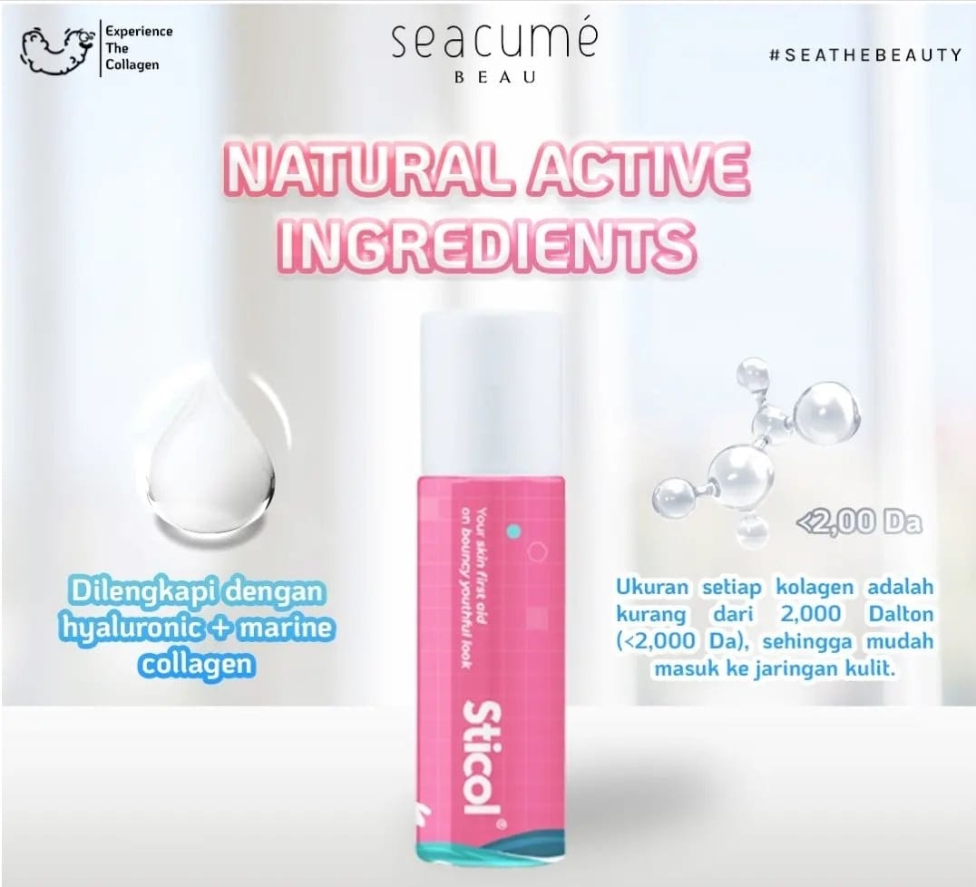 Sticol Serum adalah serum anti jerawat untuk meminimalkan dan menyembuhkan jerawat pada kulit. Dikombinasikan dengan hyalomarine untuk menjaga kulit Anda terhidrasi dan sehat. Hydrolyzed Collagen merupakan collagen yang sudah melalui proses hydrolysis. Proses hydrolysis perlu karena bentuk dan ukuran asli collagen tidak mudah diserap oleh tubuh. Ukuran collagen dalam Sticol adalah kurang dari 2,000 Dalton (<2,000 Da), sehingga lebih kecil dari ukuran pori-pori wajah. jadi hydrolyzed collagen ini mudah meresap dan masuk ke dalam jaringan ikat di wajah. Hyalomarine serum bekerja di permukaan kulit wajah untuk mengangkat bekas kosmetik dan noda serta juga bekerja dibawah lapisan kulit (epidermis & dermis) untuk meningkatkan elastisitas dan kekenyalan kulit.